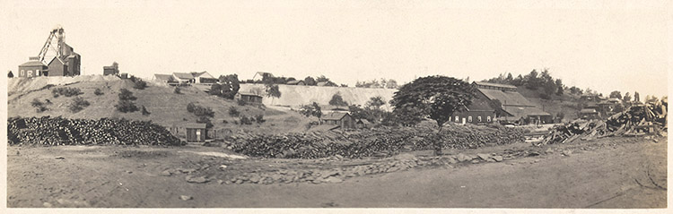 Panoramic view from the east, Cross Shaft on the left and stamp mill on right. Photo courtesy of Calaveras County Archives